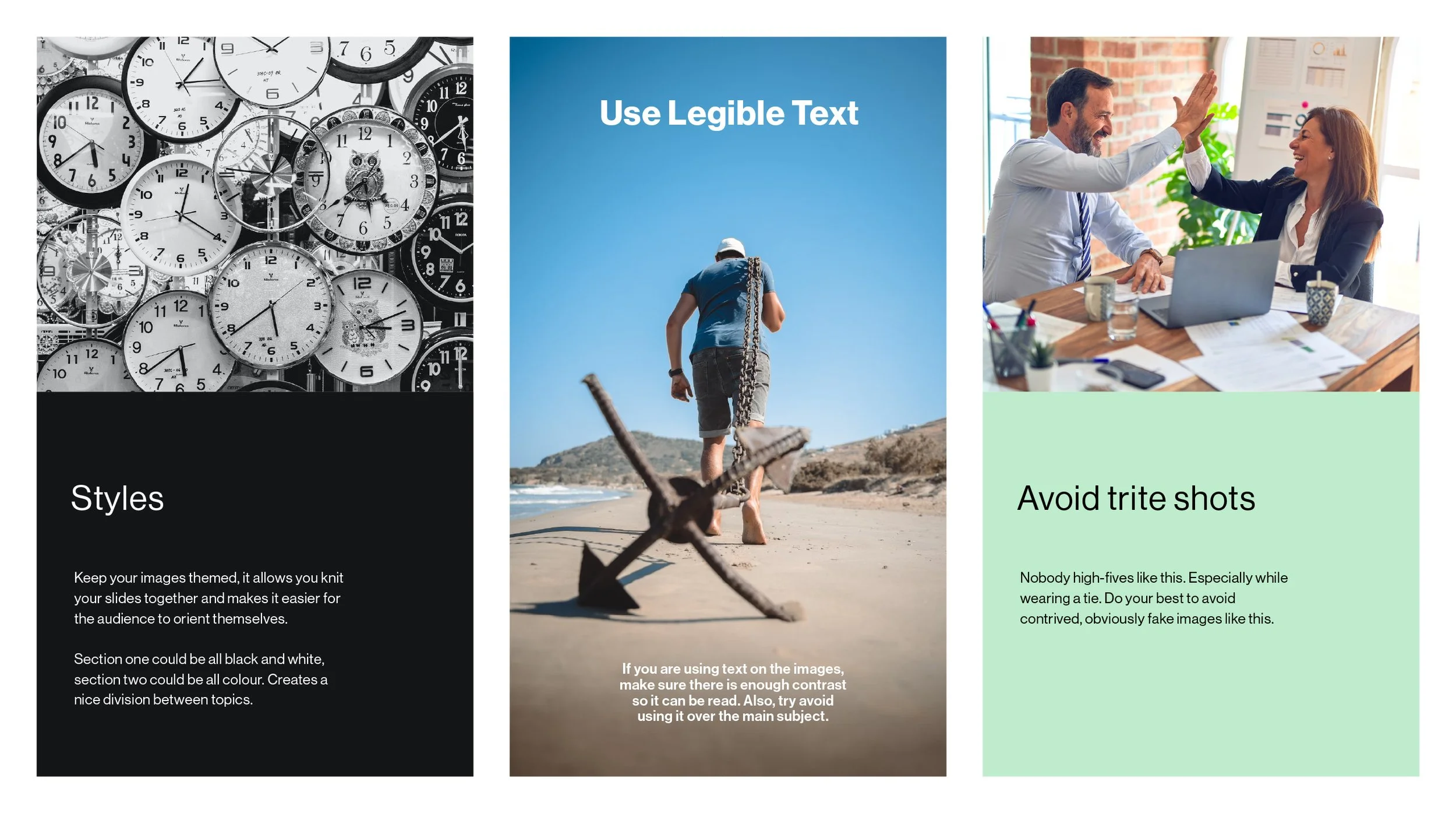 All of the images used on this page, and in the rest of the design section are from free sites to showcase this idea. Sourcing high resolution, quality images doesn’t take long, and will add serious professionalism to presentations.