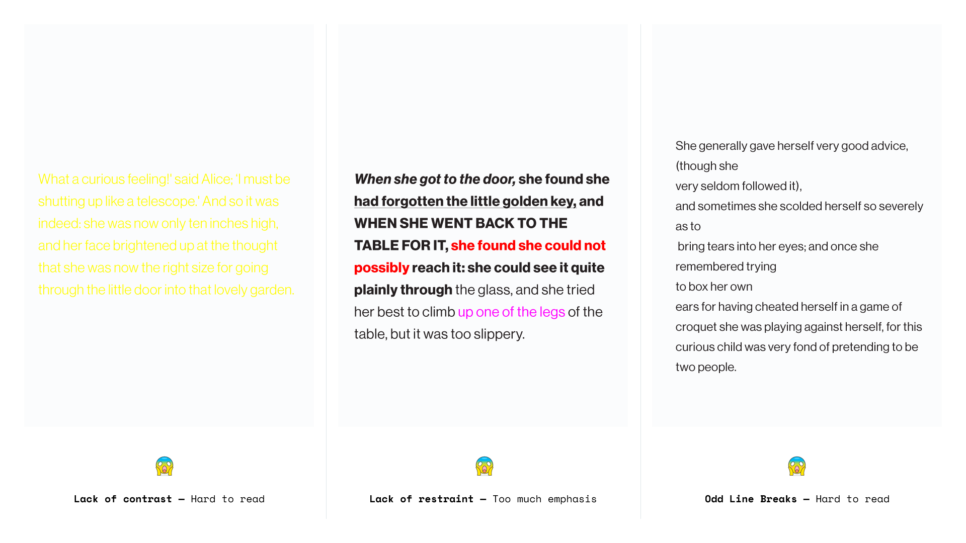 If you stick to three sizes, and a limited mixture of typefaces, you needn’t spend too much time worrying about typography.
